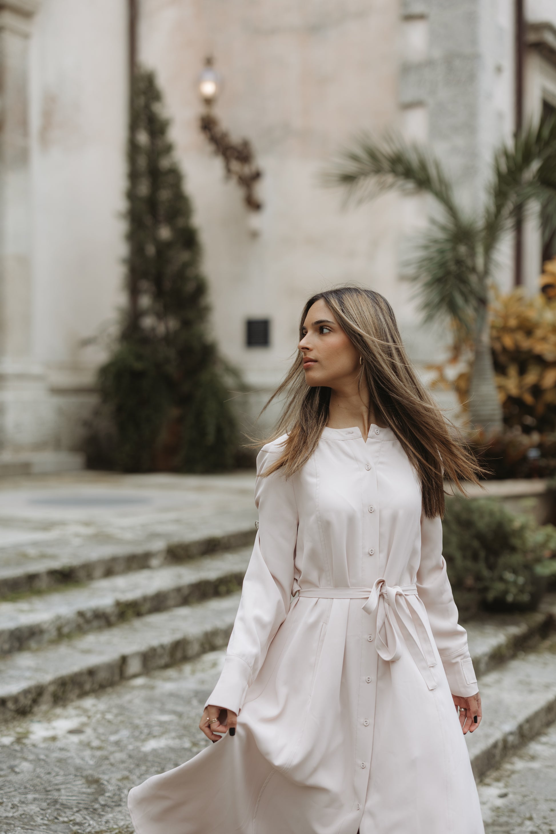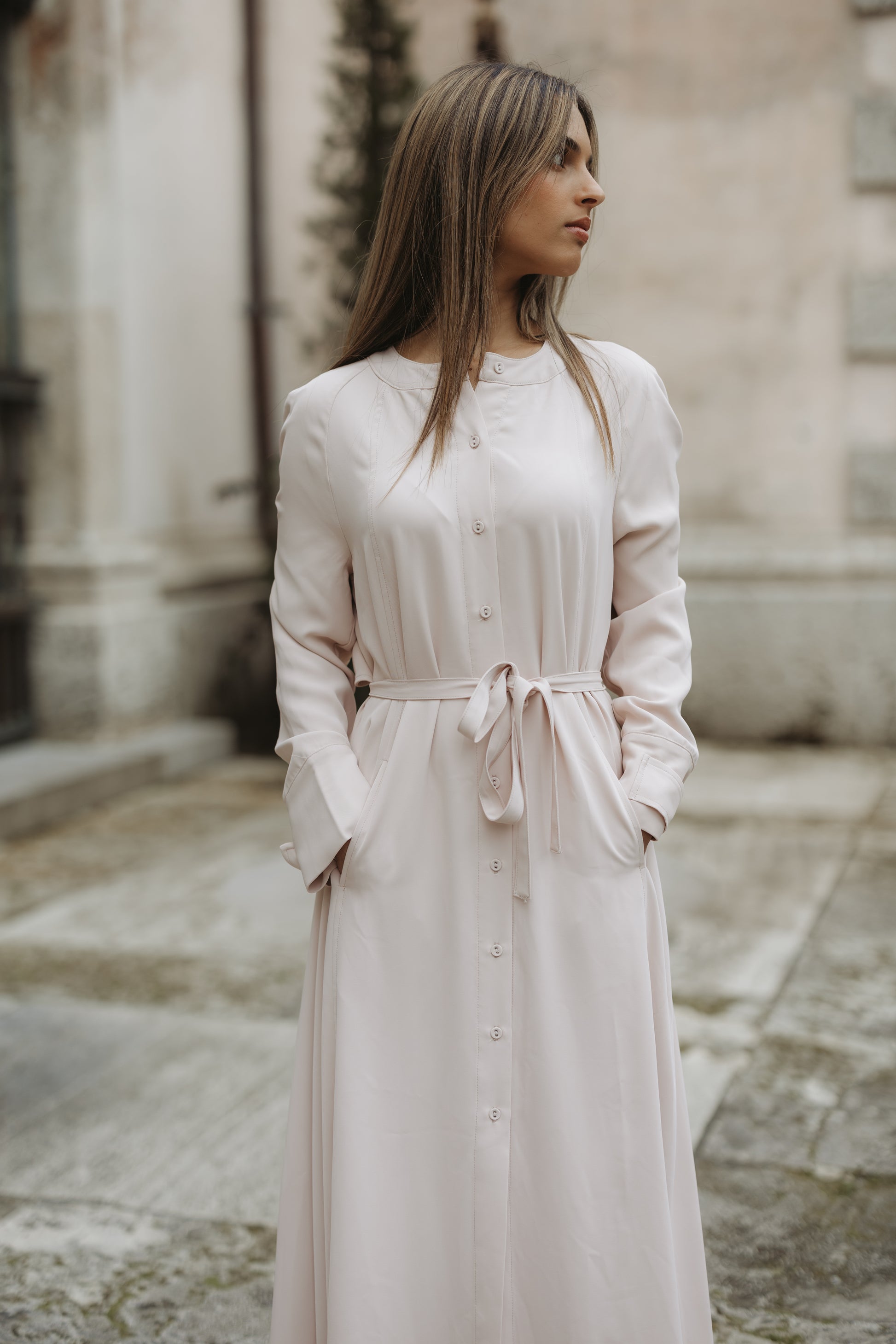 Expertly designed for sophistication, the Trenchdress features a light blush color and unique trench-like details on the sleeves and back overlay. The button down front and waist tie provide a perfect fit while the pockets add functionality. Elevate your style with this elegant and versatile dress.